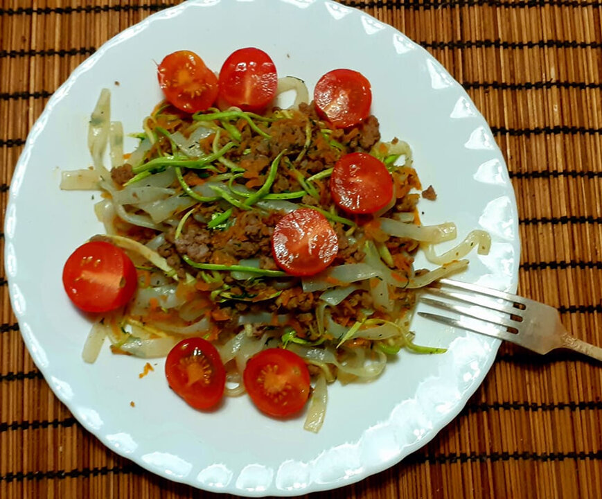 В результате набега на Ашан обзавелась спагетти ширатаки. И, конечно же, захотелось макарон. С мясом! Домашний фарш из говядины притушить с луком и морковью (моркови многовато в этот раз, каюсь), ширатаки промыть, бросить на 3 минуты в кипящую воду, откинуть на дуршлаг, соединить с фаршем-овощами и дать немного побыть вместе на сковороде, присыпав сверху спагетти из кабачка (это просто кабачок на тёрке для корейской моркови), и притушить без крышки на маленьком огне еще минуты 3. Поперчить, посыпать сухим чесноком, сбрызнуть вустерширским соусом (можно и без него), выключить огонь и дать постоять пару минут. И есть. С помидорами черри и хорошим настроением. Больше общения и рецептов - в группе "Рецепты для диабетиков" в Facebook, или в группе ВКонтакте! Рецепт на странице в Facebook Автор рецепта - Юлиана Виноградова