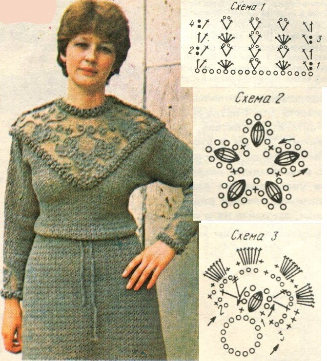 Выполняем его из 900 г шерстяной пряжи в два сложения, крючком № 2,5. Приступаем к вязанию спинки. Начинаем от линии талии и вяжем до линии груди согласно выкройке и по схеме 1. Далее с обеих сторон набираем цепочку воздушных петель длиной 37 см и вяжем спинку и рукава одновременно, делаем это на высоту 14 см, убавляя петли по краю рукава для скоса манжеты. Продолжаем вязание по выкройке с убавлением петель по верхней линии рукава и линии выреза горловины. На юбке делаем прибавления по боковой линии, вывязывая ее от талии вниз согласно схеме 1 и выкройки. Переходим к вязанию переда.