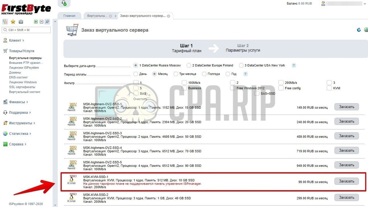 Сначала заказываем сервер. Арендуем сервер у FirstByte. Чтобы подключить до 10 смартфонов достаточно тарифа MSK-KVM-SSD-1. Стоит всего 99 рублей в месяц. Регистрируем аккаунт и заказываем виртуальный сервер. По промокоду CPARIP будет скидка 5%.