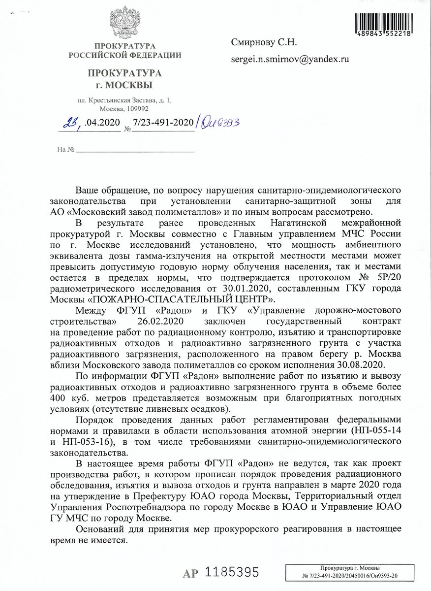 Прокуратура города Москвы не видит нарушений при проведении работ около АО "Московский завод полиметаллов". Что же здесь не так? Попробуем разобраться. Необходимость соблюдения процедур вызывает много недовольства, часто процедуры просто не соблюдают и получаем самострой, подробнее в: "Самозахват, самоуправство, самострой? Нет, не видим." Начнем с того, что ФГУП "РАДОН" ведет работы по дезактивации территории на основе тендера от УДМС. Подробно о тендере в "Тендер для полога". Напомню, что работы ведутся на двух участках: квартал 77:05:0004015 и участке с кадастровым номером 77:05:0004015:1001 принадлежит АО "МЗП" (именно на этом участке расположены участки с радиоактивным загрязнением (УРЗ) №№3165, 3166, 3167) Совершенно не понятно, на каком основании дезактивация территории АО "МЗП" проводит ФГУП "РАДОН" и на каком основании работы оплачиваются из бюджета города Москвы от управления дорожно-мостового строительства (УДМС )(ссылка на письмо в прокуратуру ниже), при этом зарубежная