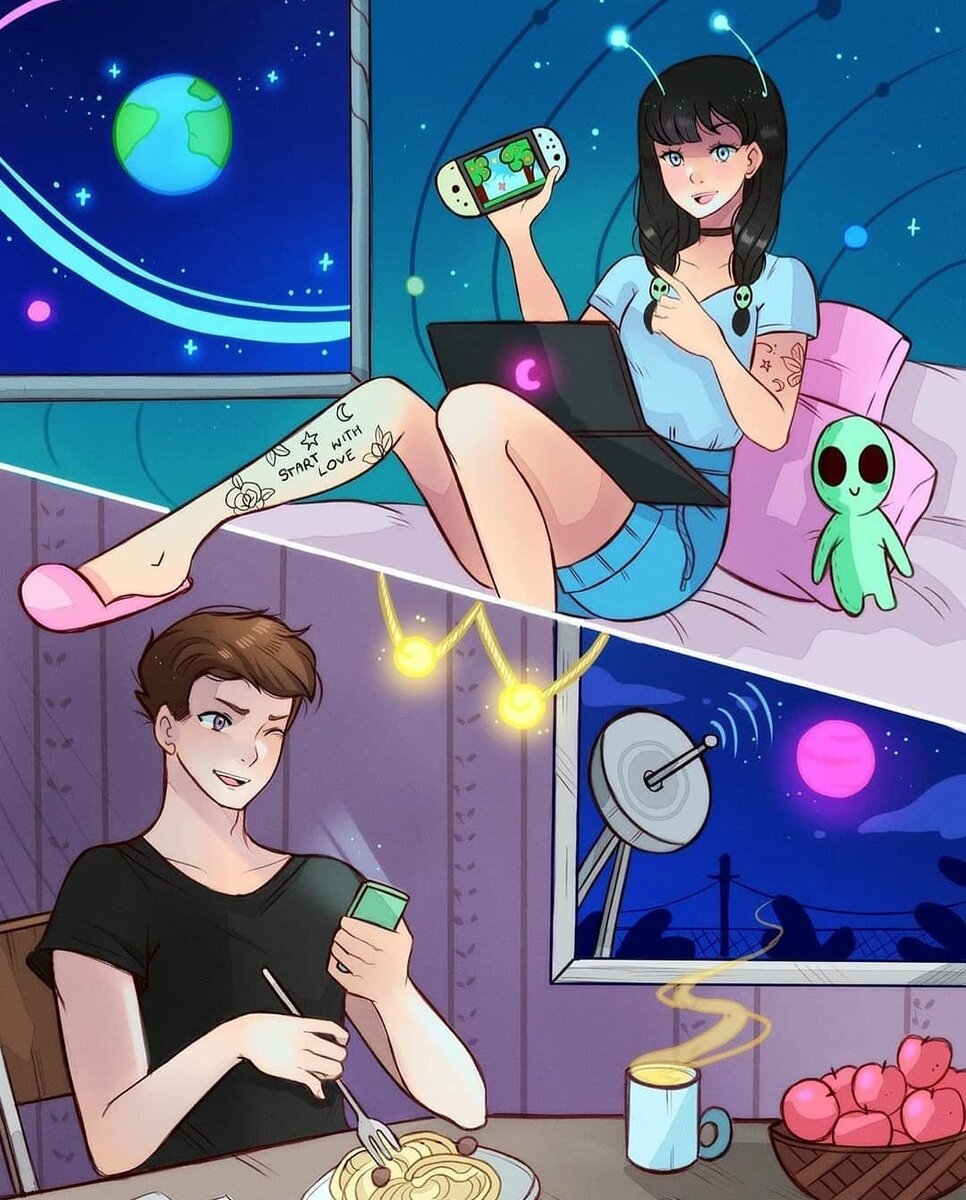 Привет, мой любимый инопланетянин, Пишу тебе с Марса, а может с Юпитера. Я потерялась средь звездных развалин, Как раньше терялась во двориках Питера. Ну что рассказать? Планета хорошая: Вода, кислород, магазин Ив Роше. Люди веселые, на нас не похожие, Хотя на дорогах и Мерс и Порше. Просто с жильём - ипотека доступная, Все для людей и все для семьи. Рыба, а может не рыба (чёрт знает), Тут крупная - доходит порою кило до восьми. Все, как у нас: и одежда и техника. Книги, киоски и даже Макдак. Только теплом льётся каждая реплика, И улыбаются все просто так. А ещё, представляешь, тут не знают про злобу. Для них так абсурдна наша война. Живут добротой с колыбели до гроба, И в декабре тут правит весна. Прошу, прилетай ко мне поскорее, Тут не хватает только тебя. Адрес, увы, не смогу дать точнее - Сюда попадают просто любя.