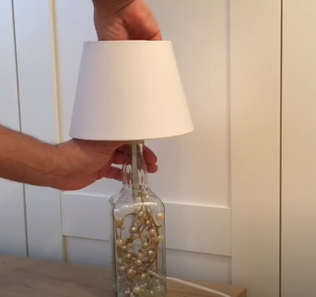После прихода гостей у меня осталась красивые бутылки и пробки. Я решила их не выбрасывать, а что-нибудь придумать. У меня получился светильник и ключница. Светильник из бутылки Недавно сломался светильник, поэтому решила сделать его. Для этого понадобилось к бутылке прикупить: Дома у меня уже был плафон от старого светильника, пистолет для клея, дрель. Чтобы сделать светильник нужно просверлить отверстие в бутылке для провода. Нужно это делать на боковой стороне отступая 1,5-2 см. Размер фрезы должен быть равен диаметру шнура. Когда отверстие готово – вставьте шнур. Если не получилось, то рассверлите место побольше и попробуйте снова. Вытащите конец через горлышко. Затем нужно подрезать шнур, чтобы провод дотянулся до розетки и был натянут внутри бутылки. На этом этапе нужно украшать пустое место в таре. Бутылку решила заполнить веточками с жемчужинками, которые остались после нового года и декоративными камушками. Потому что они усыпаны блестками и будут переливаться. Теперь при