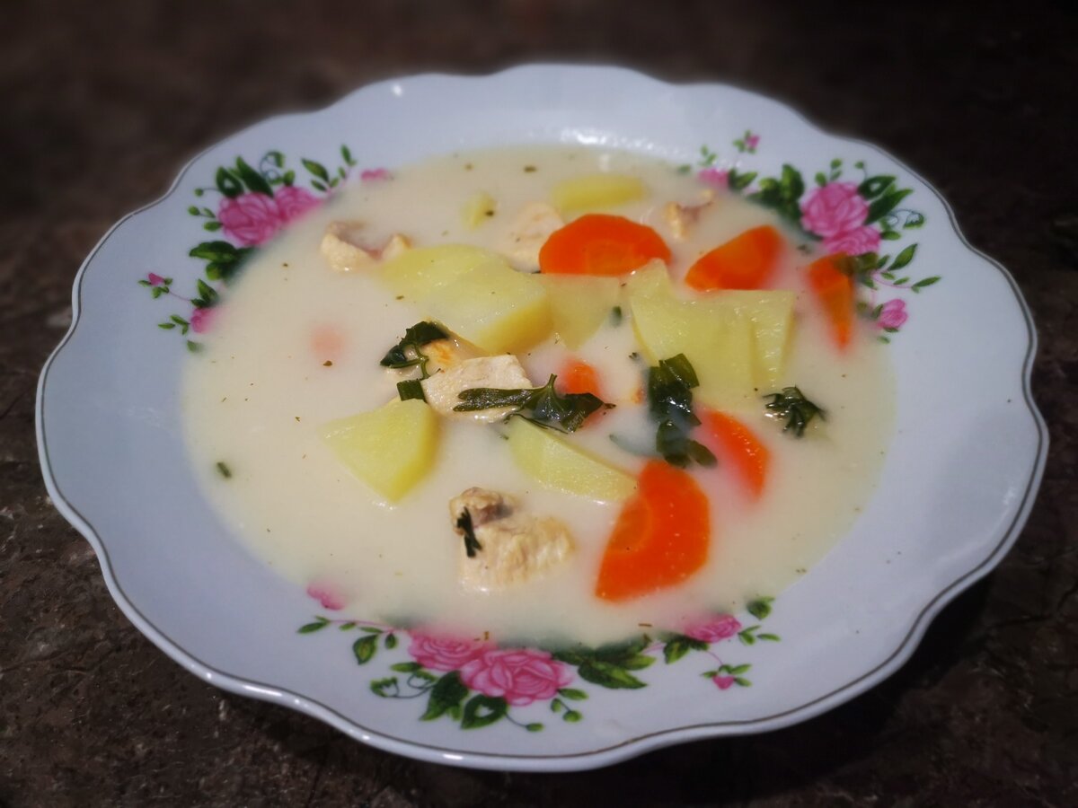 Суп - самое главное блюдо, которое подается первым. Есть не мало видов супа, но одним из вкусных и низкокалорийным считается сырный суп. А если туда добавить еще куриное филе, то он у Вас получится еще и питательным, за счет содержания большого количества белка. 100 гр данного супа даст Вам всего лишь 48 ккал! Это очень мало, не правда ли? Так что, возьмите себе на заметку те, кто активно хочет похудеть. БЖУ 5,9/1,3/3,0. Для начала нам понадобится: Берем кастрюлю на 2 лита воды. Ставим кипятить. Следом берем филе и начинаем резать кубиками. Кубики средней величины. Чистим картофель и морковь Затем, режим картофель также как и филе кубиками. Старайтесь чтобы у вас получились одинакового размера. Морковь режьте полукольцами. Разогреваем сковороду, добавляем 1 ч. ложку масла (лучше всего взять оливковое), после чего, кидаем порезанное филе и жарим до золотистой корочки. Тем временем, в кипяченную воду добавляем душистый перец, лавровый лист. Доводим до кипения. Как только у нас мясо п