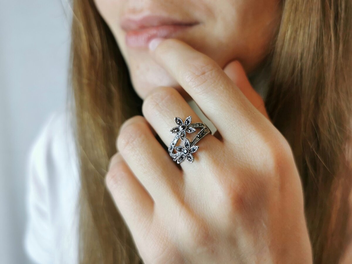 Милые цветочки правда?! И эту покупку решила от вас не таить, так мне это кольцо понравилось, сама не ожидала. https://a.aliexpress.ru/_eOO3Y7 Сейчас оно стоит 119 рублей, а я вообще за монеты купила. 😜 Но кольцо замечательное и своих денег стоит. Мне повезло с доставкой, кольцо пришло в консолидированной посылке, поэтому отслеживалась и пришло ко мне уже через 20 дней. Пришло в наимилейшей красной коробочке с бантиком. Вот такой продавец-молодец, даже коробочку не пожалел, как я люблю таких ответственных! Мне достался размер 5, диаметр 16,5 мм. Кольцо удовлетворительно сидит только на среднем пальце левой руки. Сидит прям плотно, без мыла не снимешь. Мне бы ещё 2-3 мм и все было бы ок. На безымянных оно сильно болтается, да и там не смотрится. На выбор у продавца чёрные камни из горного хрусталя и разноцветные. Размеры сейчас от 6 до 9. Изготовлено из цинкового сплава. Качество очень достойное за такую цену. Самая широкая часть в цветах 20 мм. Кольцо рекомендую! Спасибо з