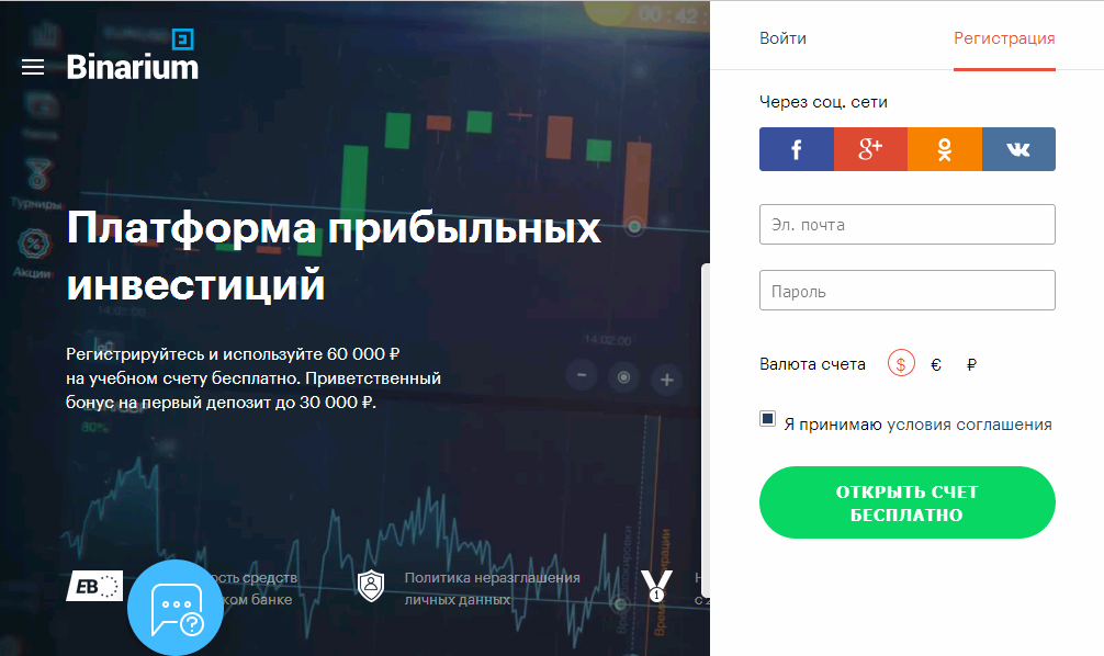 Добрый день всем кто смотрит эту статью ведь сегодня вы узнаете как заработать в интернете с помощью этого сайта https://bit.ly/2XfsudP Как зарабатывать на этом сайте по название бинариум. Для начала нужно получить статус клиента брокера, а для этого пройти регистрацию. Переходим на официальный сайт компании, где вводим личные данные в регистрационную форму. Здесь достаточно ввести действующий электронный адрес, пароль для вашего аккаунта на сайте. Также можно синхронизировать аккаунт с одной из представленных социальных сетей: Можно выбрать валюту счета. Обратите внимание, что рекомендуется отдать предпочтение доллару, это проще и удобней, нежели рубль, евро. Помните, что на электронный адрес придет сообщение для подтверждения регистрации. После чего вы получили статус клиента дилингового центра. Демо-счет предоставляется бесплатно, и выглядит он следующим образом: Как пополнить счет на Binarium Чтобы пополнить счет достаточно кликнуть на «Касса» или «Пополнить», после чего вы