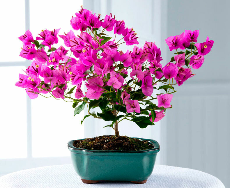 Бугенвиллия — многолетнее растение с длинными ползущими ветвями. Кустарник высокорослый, в высоту при хорошем уходе может достигать 5 метров. Ветви взрослого цветка со временем начинают одревесневать и утолщаться, что придает растению вид миниатюрного дерева. Ствол покрыт темно-коричневой корой с возрастом приобретающей серый цвет. Ветви раскидистые, покрыты острыми длинными шипами. Молодые побеги покрыты листьями овальной формы ярко-зеленого цвета. Лист имеет одну особенность — он складывается вдоль центральной жилы. Считается, что Бугенвиллея приносит в дом богатство и прибыль. Недаром азиаты используют этот цветок в интерьерном оформлении банковских помещений. Они верят, что ему под силу активизировать денежные потоки, обеспечить инвестиции и снизить риски при проведении финансовых операций. Но нужно помнить, что в денежных делах южноамериканская красавица помогает лишь тем, кто не ленится, самосовершенствуется, поднимает свою квалификацию. А чтобы усилить ее положительное значение