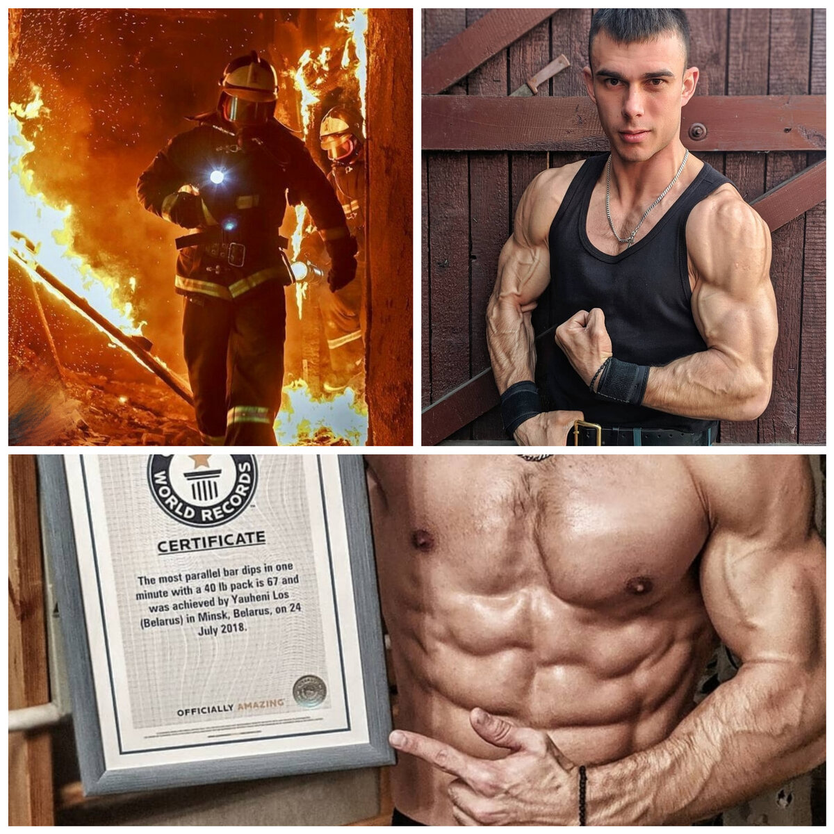 Этого атлета по праву можно считать самым сильным белорусским пожарным, хотя бы по тому, что он единственный представитель этой профессии в своей стране, установил 2 мировых рекорда. Итак, наш сегодняшний герой, 30 летний спортсмен из Бобруйска - Евгений Лось. Евгений работает в пожарной части, и тренируется уже около 15 лет, имея рельефную форму и попутно, 2 мировых рекорда в отжиманиях на брусьях. В 2018 году он отжался 67 раз за минуту с доп. весом 18 кг, а в 2019 установил новый рекорд - 53 повторения за минуту с весом 27 кг. К слову, вес спортсмена составляет всего 73 кг, при 175 см роста. Евгений Лось уже довольно долгое время имеет ютуб канал и страницу во Вконтакте, благодаря чему мы можем отследить его прогресс. И данные наблюдению показывают, что "скачков" формы не было, и за 10 лет он набрал всего около 5-7 кг мышц. К тому же не стоит забывать, что профессия пожарного, как и спасателя - очень энерго затратное занятие, и низкий процент подкожного жира при такой работе гаран