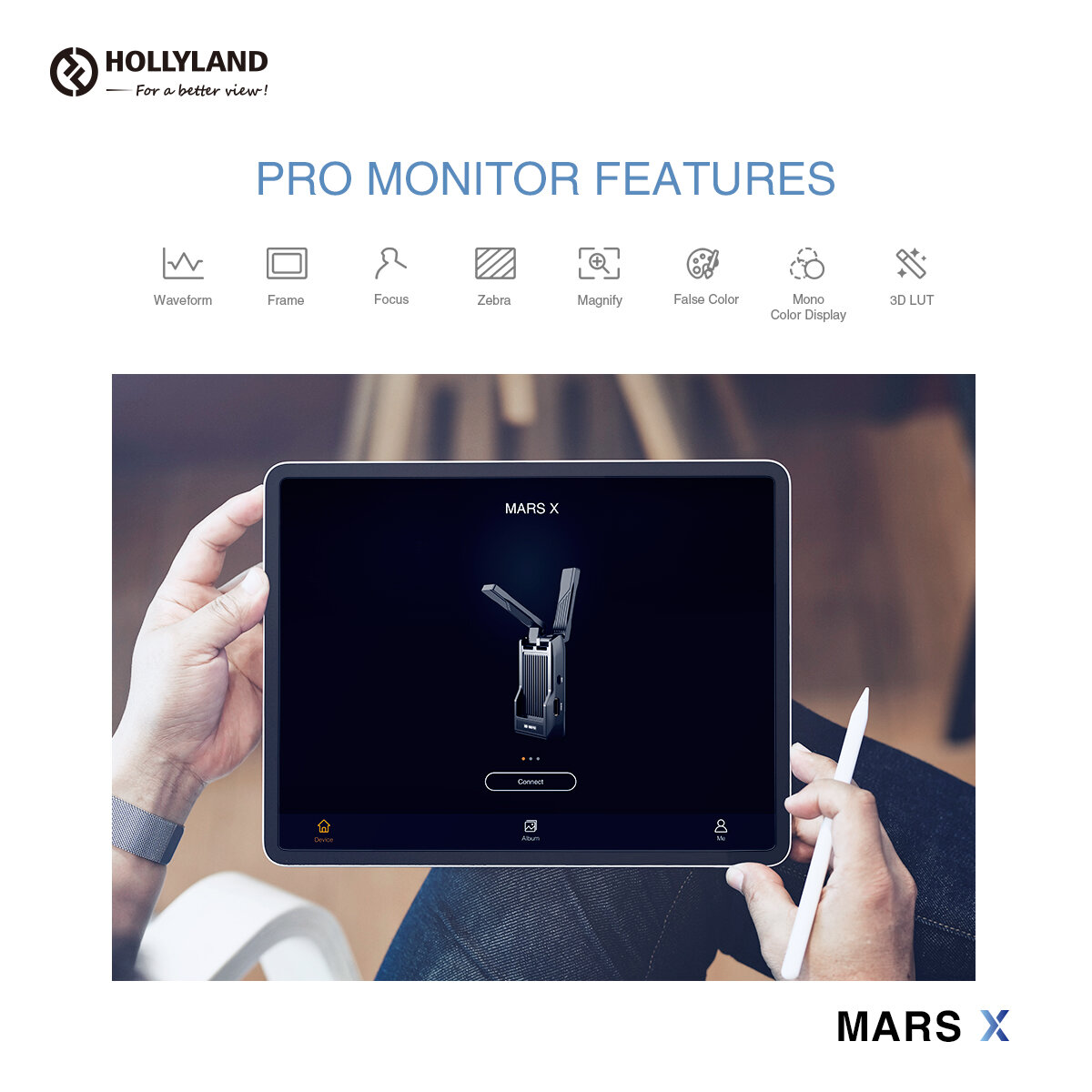 Компания Hollyland в значительной степени обновила свой подход к мониторингу снимаемого видеоматериала, упростив в новом решении MARS X практически всё, в том числе, даже количество устройств, аккумулятор и прочие мелочи. традиционно, система состоит из двух устройств, а именно, передатчика и приемника, которые, на примере самого последнего устройства MARS 400s, обычно питаются от внешних аккумуляторов NP-F. Надо сказать, что и дальность передачи на основной приемник заметно выше, 150 м по спецификации. Однако, за основу здесь взята возможность передачи данных на телефоны и планшеты под iOS и Android. К одному такому устройству можно подключить до 3 смарт устройств через обычный wi-fi, соответственно, и дальность передачи здесь соответствует стандартному сигналу wi-fi. Задержка передачи данных здесь составляет 0.7 сек, что, безусловно, больше, чем в случае Марс 400s, однако не так критично на для небольших продакшенов, когда достаточно раздать картинку режиссеру, гримеру и клиенту. З
