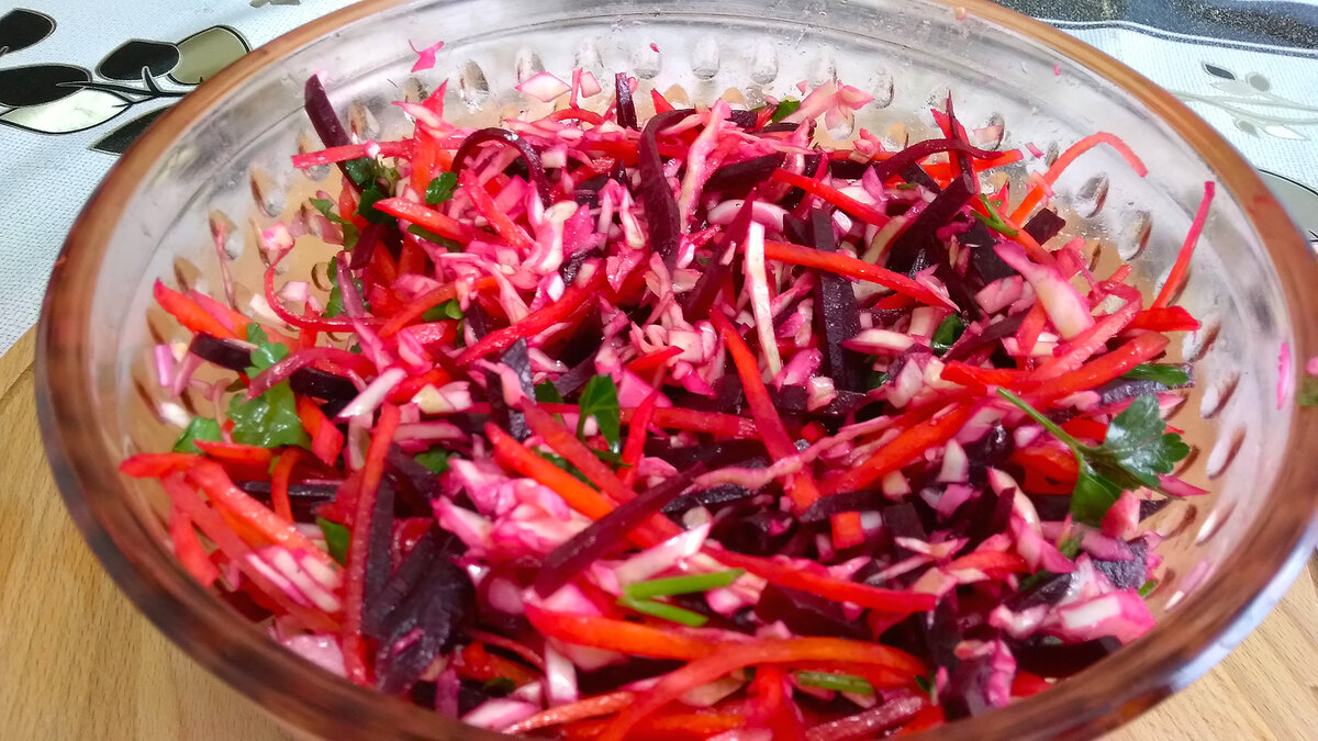 1. Нарезаем соломкой морковь, капусту и свеклу. Складываем все овощи в тару для сборки салата.