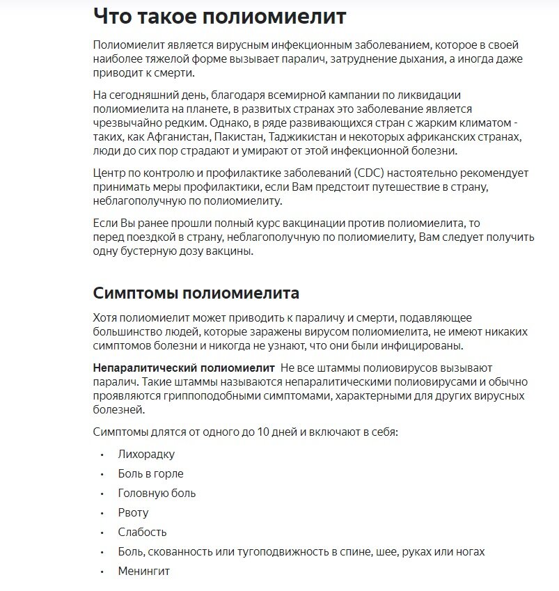 Центр по контролю и профилактике заболеваний (CDC) настоятельно рекомендует принимать меры профилактики, если Вам предстоит путешествие в страну, неблагополучную по полиомиелиту.