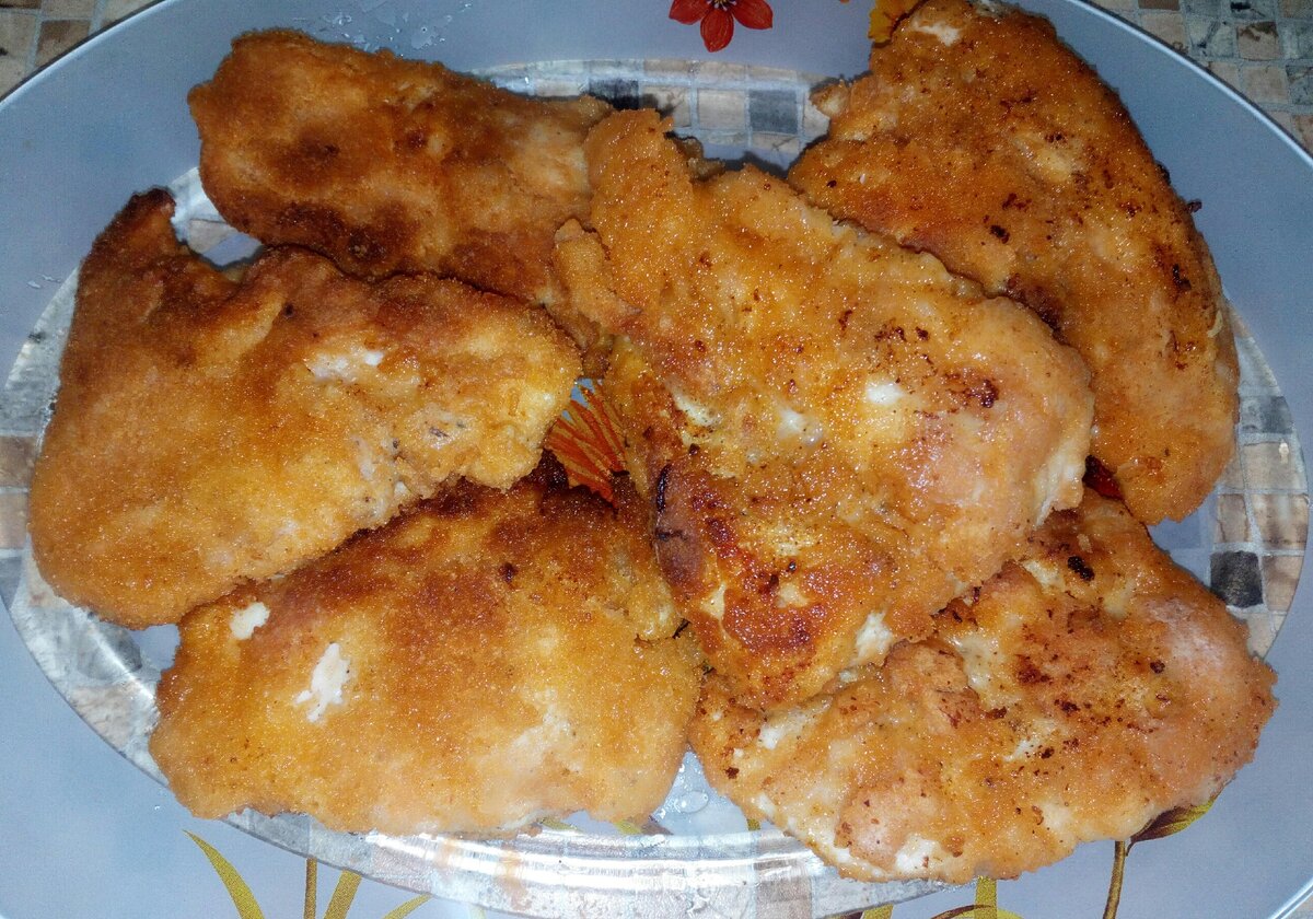 Готовлю шницели по этому рецепту уже давно! Очень нравится всем! Мясо,кстати, можно брать любое.У меня сегодня куриное филе. Я его даже не стала предварительно отбивать, просто нарезала на кусочки, посолила и добавила любимые специи. Для кляра смешала яйцо, щепотку соли, майонез и молоко. Тщательно перемешиваем и добавляем муку. Еще раз хорошо перемешиваем. На плоскую тарелку насыпаем панировочные сухари. Каждый кусочек обмакиваем в кляр, а затем обваляем в сухарях и выкладываем на разогретую сковороду. Обжариваем на среднем огне до золотистой корочки (около 5-7 минут с каждой стороны). Иногда я даже не использую сухари, а просто обжариваю мясо в кляре, получается тоже очень вкусно. Ингредиенты: куриное филе - 500 гр. яйцо - 1 шт. молоко - 0,5 стакана майонез - 1 столовая ложка мука - 4-5 столовых ложек панировочные сухари соль, специи - по вкусу. Приятного аппетита, друзья! Будьте счастливы! Берегите себя и своих близких! До новых встреч на канале АрТ Кухня!