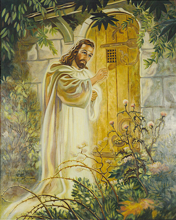 "Се, стою у двери и стучу: если кто услышит голос Мой и отворит дверь, войду к нему" (Книга Откровение 3:20) См. также Евангелие от Иоанна 10:1-5. Одной из самых распространённых христианских картинок является изображение Иисуса, стучащего в дверь. На основании этой сцены построено целое богословское учение о невозможности для Бога войти в сердце человека без разрешения самого человека. Базируясь на этом учении, многочисленные проповедники призывают верующих позволить Богу войти, впустить Его в своё сердце и т.п. Стремление греховной человеческой плоти доминировать, то есть держать всё под своим контролем, находит здесь своё высшее выражение. Держать под контролем своего супруга, своих детей, своих подчинённых на работе – это слишком мелко, а держать под своим контролем Самого Вседержителя и Творца Вселенной, позволяя или не позволяя Ему что-либо сделать – это круто! Почему бы и нет, если Он Сам установил такие взаимоотношения? Однако, это учение ошибочно. Стих Откр. 3:20 говорит вес