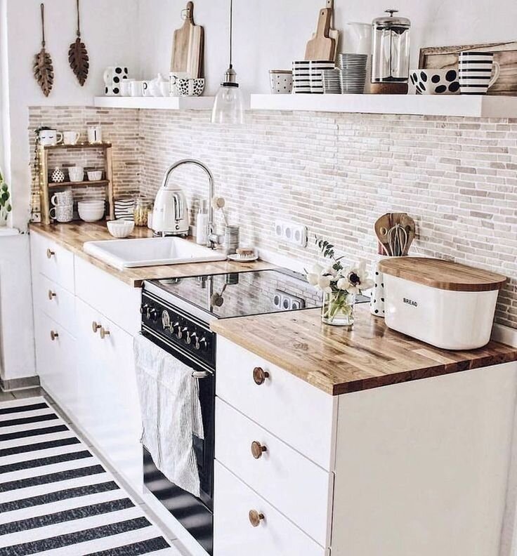 Как визуально расширить пространство кухни? Как вместить все необходимое? Как сделать красивый интерьер, который стоит недорого? На все эти вопрос есть один ответ - сделать интерьер в скандинавском стиле. В это статье я расскажу вам 5 секретов идеального интерьера. Секрет №1 - цветовая палитра. Не секрет, что светлые тона визуально расширяют пространство и делают его более мягким и уютным. В скандинавском стиле преобладает белый цвет. Благодаря белому цвету кухонные фасады как бы растворяются на фоне стен и визуально делают пространство больше. Секрет №2 - отделка из древесины и камня. Столешницу в скандинавском стиле обычно делают из древесины в которой сохранен натуральный рисунок и цвет. Из нее могут быть сделаны и навесные полки. Древесина придает интерьеру теплоту и уют. В некоторых случаях используют покрытие под натуральный камень. Секрет №3 - навесные полки и рейлинги. Зачастую в скандинавском стиле отказываются от навесных шкафов так как они сильно загромождают пространство