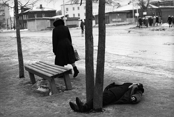Быть пьяным означало, что вы пьете водку, пока не упадете буквально на пол. Не было «навеселе», «под погодой» - ты выпил, а потом потерял сознание. Проснувшись, вы можете отправиться на охоту за новой бутылкой водки. Это был единственный смысл в жизни многих советских людей.
