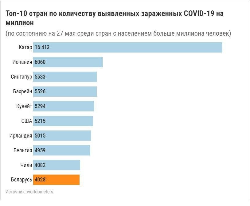 На 27 мая в Беларуси зафиксировано 38 956 случаев заражения COVID-19. Впервые за последние 3 недели в сутки выявили до 900 зараженных - 897 человек. Это радует. Зато не радует то, что Беларусь вошла в десятку лидеров по числу больных COVID-19 на миллион населения. Список возглавляет Катар с 16 413 зараженными, далее идет Испания с 6060 и Сингапур с 5533 заболевшими на каждый миллион граждан. Беларусь на 10 месте с 4028 инфицированных. Невеселый рекорд. И он не единственный: по общему числу больных в стране Беларусь попала в топ-25, заняв 22-е место. “Рядом” с нами - схожие по величине населения страны - Бельгия и Швеция, занимающие 19 и 25 места соответственно. Минздрав пояснил числа зараженных большим количеством сделанных тестов. По их словам, в нашей стране их сделали вдвое больше, чем в Швеции, но в 1,5 раза меньше, чем в Бельгии.