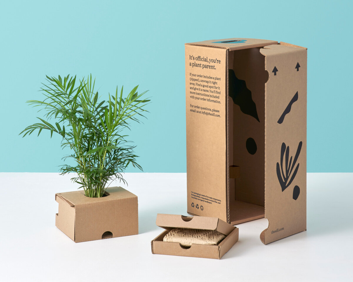Специалисты из американского креативного агентства ATLASON разработали конструкцию упаковки из гофрокартона для доставки горшечных растений интернет-магазина The Sill. Упаковка представляет комплект из нескольких коробок разного размера, для разных растений. Комплект упаковки, разработанный для The Sill, позволяет легче и лучше упаковывать, и распаковывать растения. В упаковке используется меньше упаковочных материалов, чем в ранее используемой The Sill, и она обеспечивает более безопасное путешествие для растений в горшках. Все материалы в упаковке изготовлены из натуральных материалов (без пластика) пригодных для повторной переработки. Конструкция упаковки для растений Упаковка изготовлена из гофрокартона, и состоит из нескольких деталей, количество меняется в зависимости от количества упаковываемых растений. В упаковочный комплект входит транспортная коробка с боковой-откидной крышкой, и отверстием в верхней стенке коробки. Вкладыш для укрепления боковых стенок коробки. Внутренняя