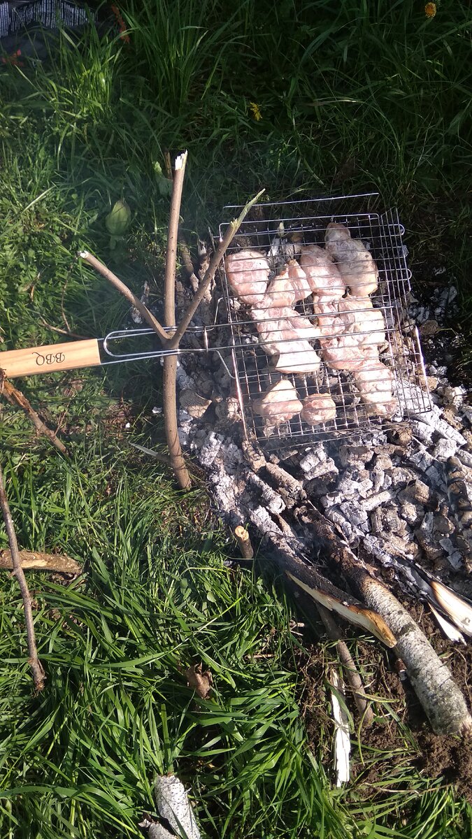 решил сделать шашлычок купил все забил сумку и на речку ,пришел разложился а тут мангала то нету дома остался что делать,подумал надо камней или кирпич взять но фигу тут нету нечего лесок не тот так ток мелкие деревья,подумав пораскинув мозгами ,из упавшего деревца отломил пару веток так чтоб получились рогатки. одну ветку воткнул так чтоб держать над углами сетку с мясом а другую рогатину воткнул в землю так чтоб удержать сетку чтоб не упала в уголь , как углей было много а высота небольшая у палок ,раскопал палкой землю и закинул уголь ну и не забывая закинуть картошку туда. всегда можно найти выход главное немного подумать и немного креатива.