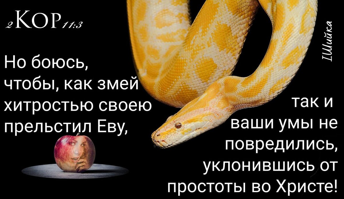 Апостол Павел предостерегает Церковь в Коринфе, чтобы они не отклонились от простоты Евангелия Иисуса Христа. Оказывается, что слушая коварных духов, которые проникли в церковь, человек снова может потерять рай. Напомним, как это происходило в Эдеме. Змей, будучи хитрым и коварным, объяснил наивной Еве, что она ограничена в своей свободе, ведь у нее есть заповедь не есть с дерева познания добра и зла. - Действительно, - подумала Ева, - я могла бы быть гораздо счастливее в том Эдеме, если бы не религиозные рамки, связанные с этой одной заповедью. А тем более хитрый змей пообещал ей, что, вкусив от дерева, они - не умрут! Таким образом, имея все райские условия, человек соблазнился и начал доверять словам сатаны больше, чем Слову Господа Бога своего. Поэтому, даже если вы дети Божьи, смотрите, чтобы снова не впасть в искушение и не поддаться рабству греха. Читайте Евангелие и верьте Слову Божьему, чтобы вам расти в благодати и познании Господа нашего Иисуса Христа! (Ирина Шийка)
