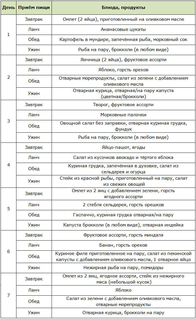 Результаты: за месяц реально похудеть на 10 кг. Представляет собой чередование белкового и углеводного питания по дням. Разработана для быстрого и эффективного похудения за счёт уменьшения подкожно-жировой прослойки, что позволяет улучшить мышечную рельефность. Во время белковых дней организм не получает углеводов и начинает активно расходовать жировые запасы. Чтобы не допустить расщепления белков, после этого устраивается углеводный день, а затем — смешанный (для восстановления сил). Схема: 2 белковых дня — 1 углеводный — 1 смешанный. Полный курс похудения: 7-8 таких циклов. Суточная калорийность: 1 200 ккал. Питание дробное. Питьевой режим: по 2 л воды в день. Варианты схем:
