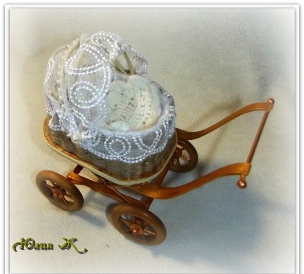 Дуги, вставила в корзину и пришила. Затем начала оформлять кружевом корзинку, вставила матрасик и его также, пришила потайным швом.Подушечки, оформлена тем же кружевом, что и коляска.