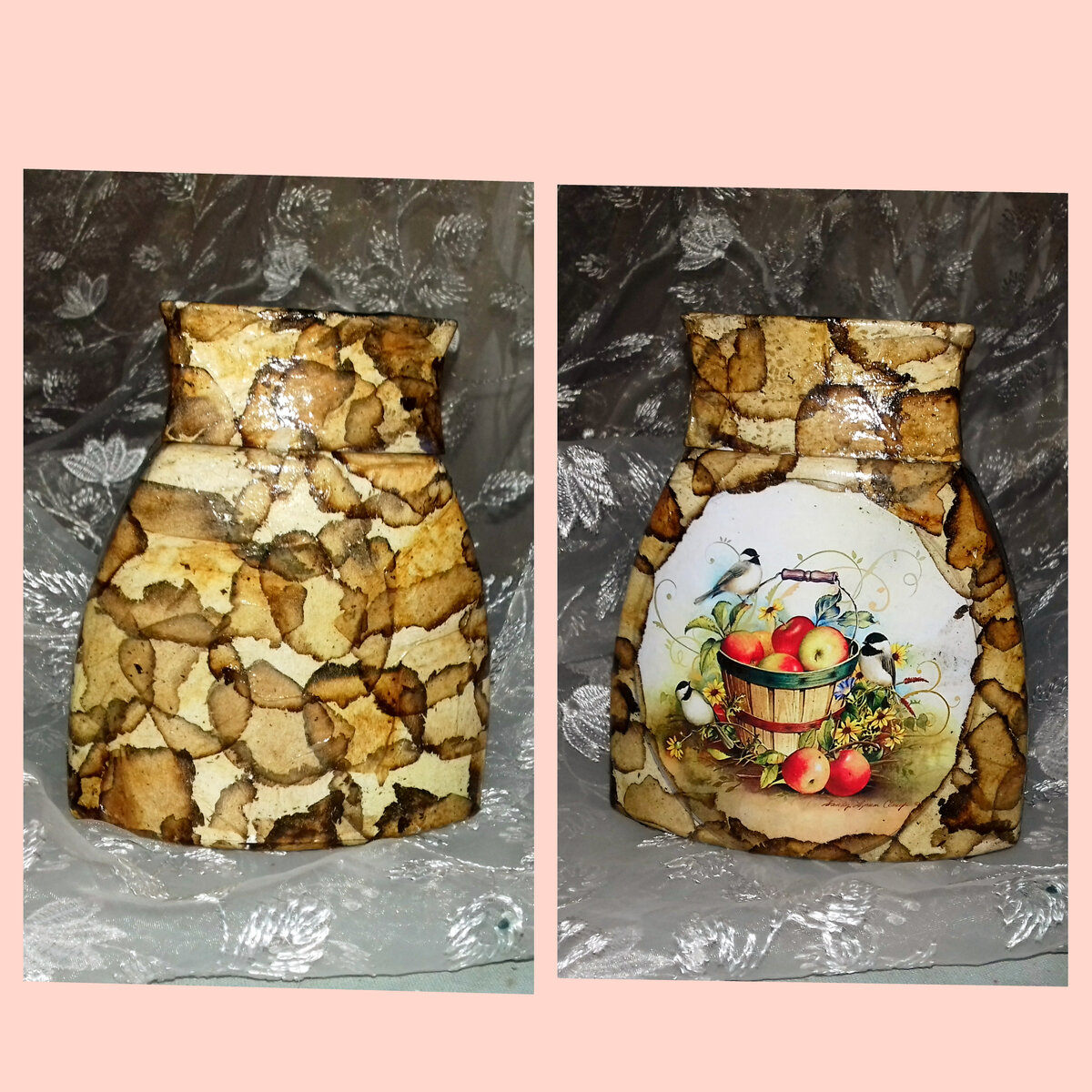 Подробный видео мастер класс https://youtu.be/sSUXLreQ5P0. Банку отмыть от этикеток. Обезжирить спиртом или жидкостью для снятия лака. Нанести белую акриловую краску губкой. Картинку - распечатку лазерного принтера отрезать, на изнанку наклеить бумажный скотч сплошным слоем. Уголок поддеть иголкой, отделяя верхний слой бумаги. Аккуратно, не спеша, отделить . Переложить на файл изнанкой вверх и кистью намочить водой или обрызгать из пульверизатора. Лицевую сторону банки смазать клеем пва. Файл картинкой перевернуть банке. Разгладить пальцами пластиковой картой . Файл аккуратной снять, кистью придерживая картинку. Края подклеить. Чайные пакетики очистить от заварки. Разрезать на кусочки. Крышку тоже покрыть акриловой краской. Взять сразу несколько кусочков 4 -5 шт быстро обжечь края на пламени свечи. Приготовить влажное полотенце и тушить края об полотенце. Кусочки наклеить на клей пва . Краями заходить на предыдущий кусочек. Так об
