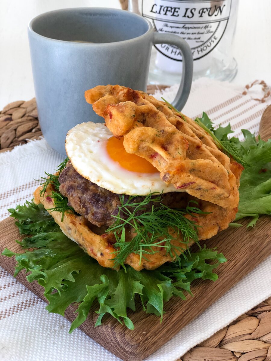 Сегодня у нас поздний завтрак, практически бранч. Поэтому он более сытный, чем мы готовим обычно в выходные дни. При этом, традиции печь по выходным вафли никто не отменял. Вот мне и подумалось - почему бы не сделать мясные вафли - гамбургеры? Сказано - сделано, у меня этот процесс происходит быстро😂 Готовим? Нам понадобится: 🍔 150 г фарша 🍔 50 г сыра (у меня моцарелла с паприкой) 🍔 2 яйца 🍔 75 мл растопленного сливочного масла 🍔 130 г молока 🍔 130 г муки 🍔 75 г болгарского красного перца 🍔 пучок укропа 🍔 15 г томатной пасты 🍔 1 ч ложка разрыхлителя 🍔 1/2 ч. ложки копченой паприки 🍔 1 ч. ложки соли Приготовление: 👉 Фарш смешиваем с яйцами, молоком и растопленным сливочным маслом 👉 Перец нарезаем кубиками, сыр трем на крупной терке, укроп нарезаем мелко, добавляем в тесто с фаршем, перемешиваем 👉 Муку просеиваем в отдельную миску, смешиваем с солью, разрыхлителем, паприкой 👉 Добавляем мучную смесь в тесто, перемешиваем, чтобы не было комочков 👉 Выпекаем вафли на разо