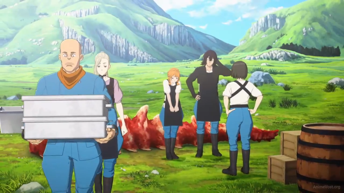 Ловим, разделываем, едим. Второй пункт, который меня действительно заинтересовал это собственно повседневная жизнь нашего отряда, ибо это было, как минимум неожиданно. В то время, как большинство приключенческих аниме делают упор на подвиги или экшен, нам показали своеобразную бытовуху.