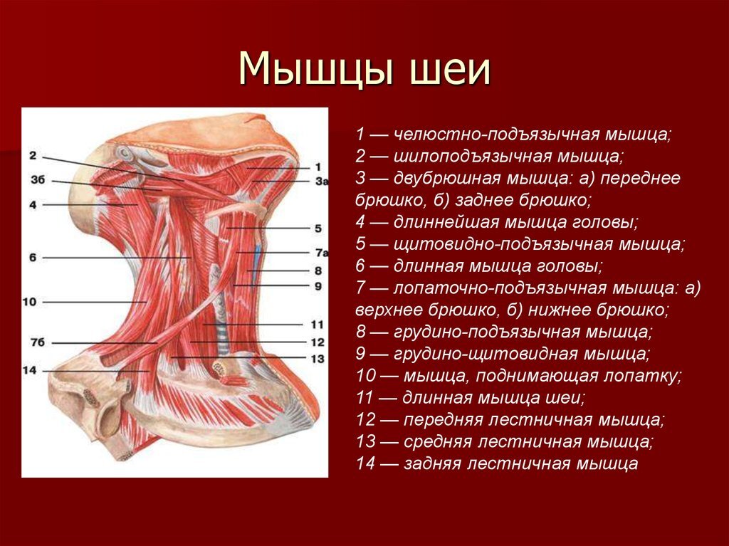 Мышцы шеи Мышцы шеи представляют собой крупный массив глубоких и поверхностных мышц, главными функциями которых являются: В бодибилдинге чаще всего мышцы шеи не подвергаются отдельным тренировкам, однако они участвуют во многих силовых движениях, в частности, при тренировке трапеции и дельтовидных мышц. Тренировка и укрепление шейных мышц позволяет предотвратить шейный остеохондроз и развитие болей в области шеи в будущем. Функции и строение отдельных мышц шеи Шейные мышцы принято разделять на глубокие и поверхностные. Начнем с глубоких мышц шеи: Длинная мышца шеи- Передне-боковая сторона позвоночника на уровне от первого шейного до третьего грудного позвонка.Её функция: сгибание головы и тела, мышца-антагонист мышцам спины. Длинная мышца головы- Передние бугорки поперечных отростков 2-6 шейных позвонков, идет вверх и медиально, функция: сгибание головы и тела, мышца-антагонист мышцам спины. Передняя лестничная мышца- Поперечные отростки шейных позвонков, функция: подъем рёбер при