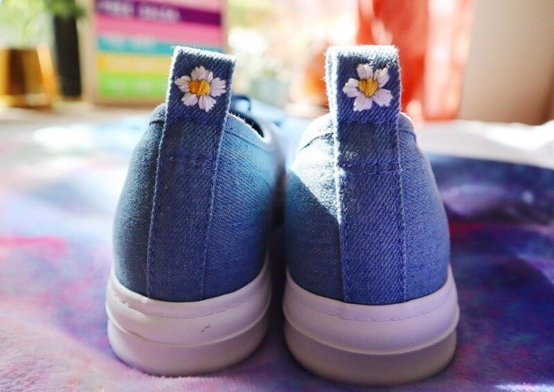Самый простой способ украсить летние тапочки небольшим вышитым элементом - это добавить на хлястик над пяткой небольшую ромашку. Времени это займет немного, а удовольствие от процесса вы точно получите. Такая милая деталь будет отличать ваши кеды от тысячи других похожих моделей.