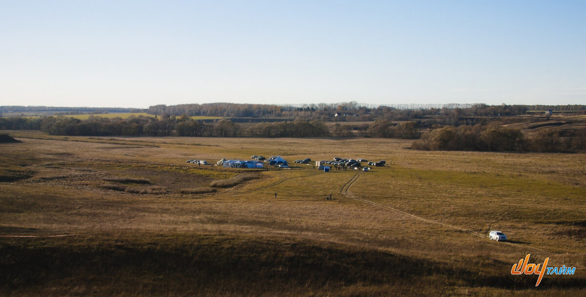 Вид на стартовый городок мероприятия «Внедорожный тест-драйв Toyota LC Prado». Специально для этого события была подготовлена внедорожная трасса протяженностью 1200 метров на красивейших склонах неподалеку от древнего города Ожска, полностью сожжённого татарами в 1237 году. Это рядом с селом Вышгород, Рязанская область.