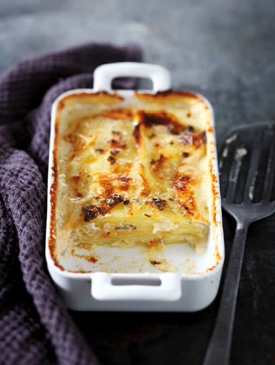 Вылить сливки в запеканку и разогреть. Добавьте измельченный рокфор и перемешайте. Аккуратно приправьте солью и перцем, затем вылейте смесь на картофель.
