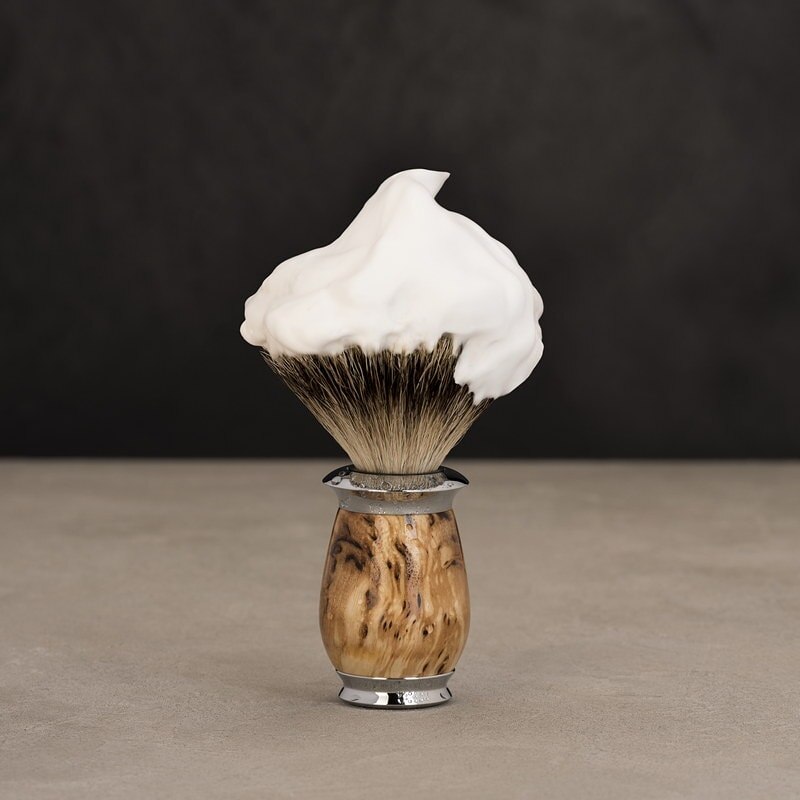 ПОЛУЧЕНИЕ ПЕНЫ Хорошая пена для бритья состоит из трех ингредиентов: мыльной основы, воды и воздуха. А качественный помазок помогает соединить эти ингредиенты в одну субстанцию. При взбивании пены на лице, в ладони или в чаше мыльная основа из крема или мыла для бритья соединяется с водой. Благодаря этому пена эффективно увлажняет эпидермис и щетину. Влажная пена легко проникает в волосы. Благодаря щелочи, которая есть в мыльной основе, она делает щетину мягкой. ПОДГОТОВКА КОЖИ И ЩЕТИНЫ К БРИТЬЮ Некоторые начинающие ветшейверы используют кисть для бритья исключительно для переноса пены на лицо. Они взбивают отличную пену в чаше, после чего просто равномерно распределяют ее по лицу. Эта ошибка резко снижает эффективность бритья. Пену недостаточно просто распределить по лицу. Перед бритьем необходимо в течение нескольких минут массажировать область бритья помазком. Это решает такие задачи: - Приподнимает щетину. Обычно волосы на лице лежат, поэтому их сложно сбрить без нажима на бритву