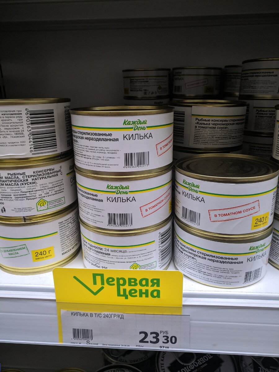 Добрый день, дорогие читатели! Как-то раз покупал кильку в томатном соусе "каждый день" из ашана, тогда она стоила всего 19 рублей и была очень вкусная и достойно выглядела, рыбки были цельными, запах был классическим, в общем идеальная килька в томатном соусе за фантастические 19 р.. Сейчас полки с этой килькой в местном Ашане опустели уже как на месяц, ценник есть, а кильки все так и нет. И не понятно, толи ее раскупают, толи не привозят.. Пару дней назад заходили с друзьями уже в другой Ашан и увидели такую же кильку, но уже за 23 р., конечно же сразу же взяли пару баночек и еще одну тушенку "Ашан", по ней у меня тоже есть обзор. На банке указан тот же г. Керчь и тот же производитель что и раньше ООО "Пролив". Говорят, что лучше когда место производства близко к прибрежной зоне, так сырье должно быть более свежим, что несомненно влияет на вкус и качество продукта. Состав у консервы не плохой, смущает лишь то, что последняя купленная партия изготовлена из мороженного сырья. После в