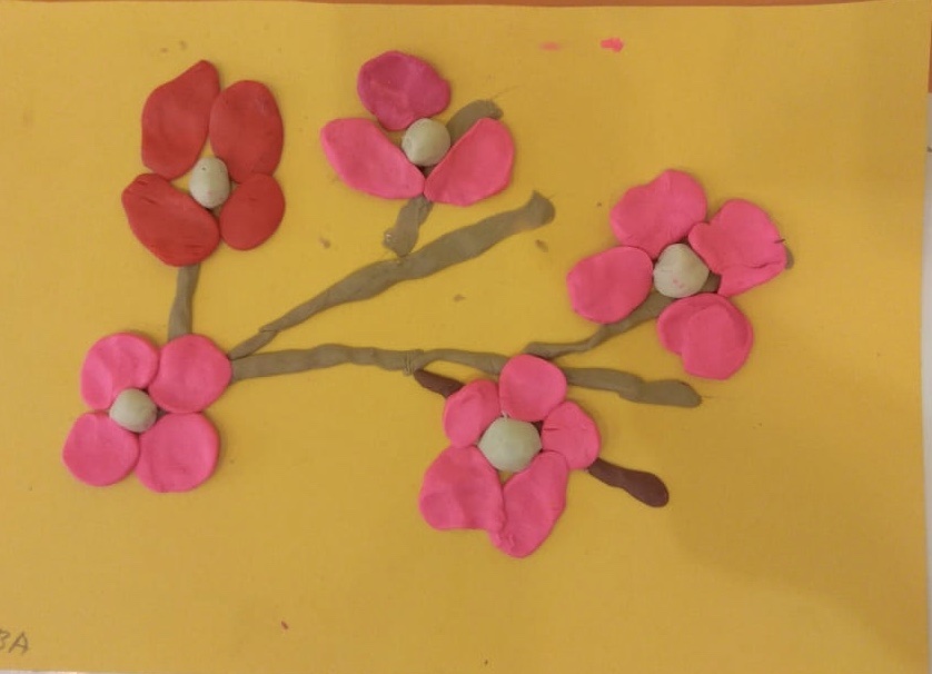 Нам понадобиться: дощечка для лепки , пластилин , цветной картон ,для фона, пластиковый нож. Лепка очень полезна для развития мелкой моторики у детей. Очень важно чтобы ребёнок разминал пальчиками пластилин . Обязательно катал шарики между ладошками , это помогает в развитии речи . На улице сейчас все цветёт и я предлагаю сделать веточку с цветами . Сначала на цветном картоне делаем веточку из коричневого пластилина , затем начинаем делать цветы и закреплять их на получившейся веточке.