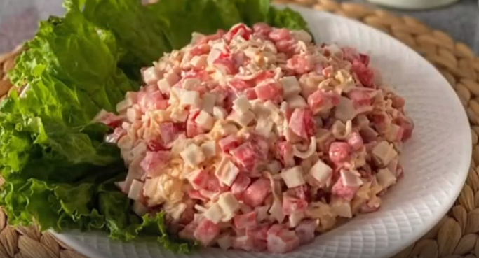 Доброго времени суток уважаемые читатели.Предлагаю вашему вниманию лёгкий салат.Для этого понадобится пачка крабовых палочек,3-4 небольших помидоры,1-2 зубка чеснока,100 грамм сыра,майонез и соль по вкусу.Мелко нарезаем крабовые палочки,добавляем мелко нарезанные помидоры,натираем сыр и чеснок,заправив всё майонезом и перемешав подаём на стол.Приятного аппетита.