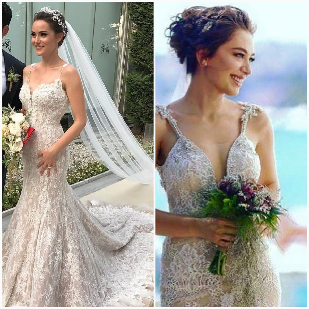 Всем привет! С каждым годом в турдизи остаётся всё меньше "холостых" актеров и актрис😀 Все привыкли видеть сериальные свадьбы, поэтому всегда бывает интересно, как провели они свою реальную свадьбу. И сегодня мы посмотрим, в каких платьях вышли замуж одни из самых популярных актрис Турции. *´¨`*• Неслихан Атагюль •*´¨`*• Неслихан сегодня одна из самых знаменитых и востребованных актрис Турции. Сделав долгий перерыв после съемок в "Черной любви", она начала сниматься в сериале "Дочь посла", который также пользуется немалым интересом публики. Со своим будущим мужем, актером Кадиром Догулу, Неслихан познакомилась во время съемок сериала "Два лица Стамбула". Пара начала встречаться и в 2016 году они поженились. В день свадьбы Неслихан сменила два платья.