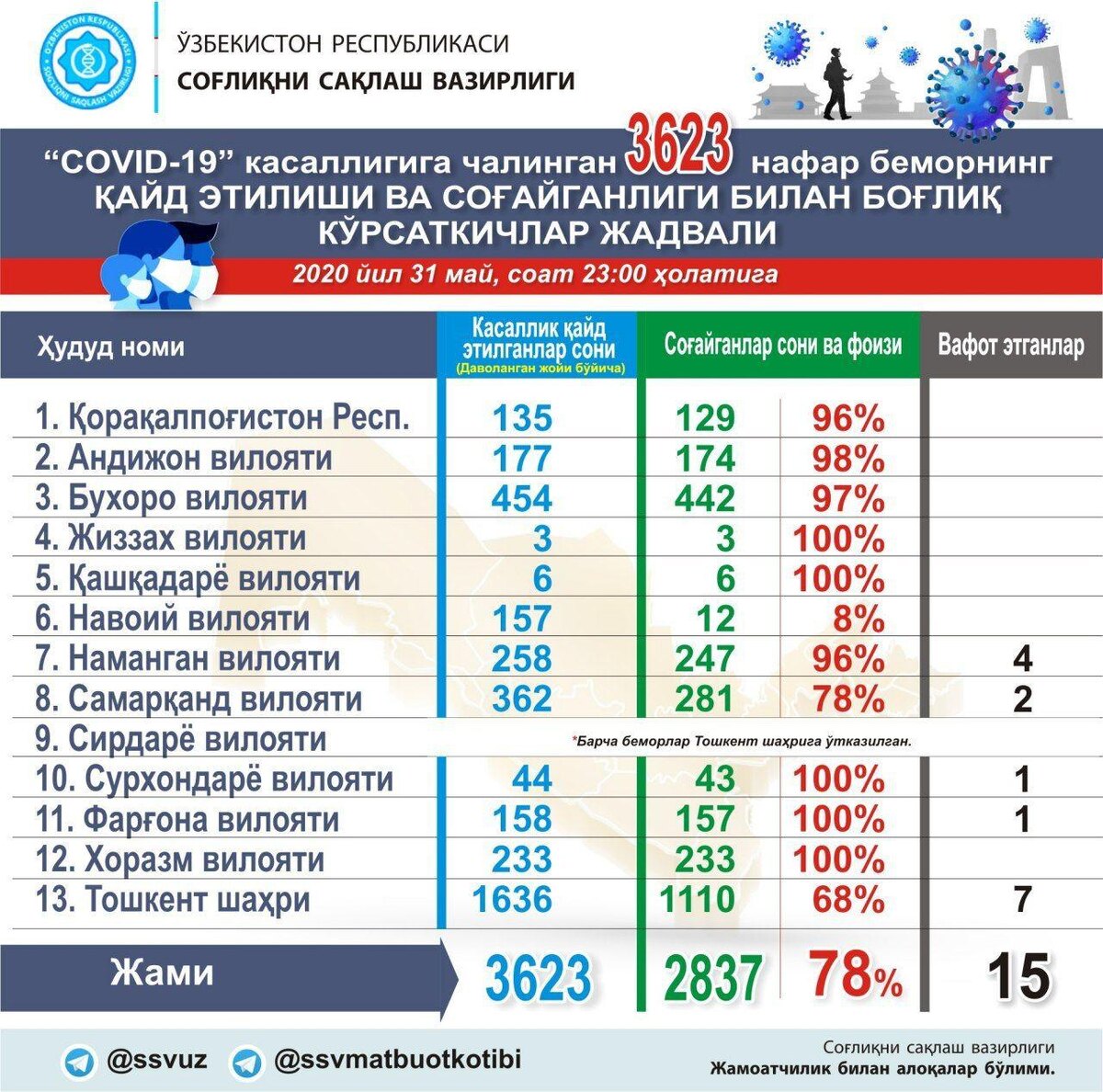 Узбекистан, Ташкент – АН Podrobno.uz. Навоийская область вышла на первое место по числу новых пациентов с коронавирусом. За сутки, с 30 по 31 мая, здесь обнаружили 38 больных, сообщает корреспондент Podrobno.uz со ссылкой на отчет Минздрава. Второе место у Ташкента с 32 больными, третье у Бухарской области (+5), четвертое – у Самаркандской области (+2). "На сегодняшний день из 77 случаев коронавирусной инфекции 38 были подтверждены среди граждан, находящихся под медицинским наблюдением в карантинных учреждениях Навоийской области. Кроме того, 34 человека были выявлены в карантинных учреждениях в других областях, 3 – в Бухарской области и 1 – в Ташкенте среди населения и 1 – это водитель-дальнобойщик", – сообщили в министерстве. Статистика прироста по регионам: Каракалпакстан – 135 (+0)