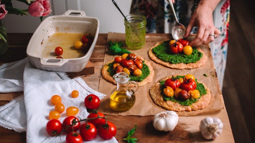 Все мы помним как говорит мой муж про пиццу? “Пицца всегда хороша, даже если она плохая”. Мы как-то раз готовили пиццу, а теперь я вас научу делать мини-пиццу. Вообще, могу сказать что сочетание получилось довольно необычное. Хотя в основе песто и помидорки, но на вкус это так необычно! Поэтому всем советую попробовать. Я действительно не встречала человека, который сказал бы мне, что ему не нравится эта пицца. Но муж обычно кладет прошутто на пиццу, или бекон и лук. А эти мини-пиццы были немного более "легкими" и полностью вегетарианскими. Помимо ароматного зеленого песто, на нем вы найдете только вкусные и сладкие жареные помидоры. Комбинация ароматов настолько совершенна, что даже плотоядное животное, мой муж, не смог устоять. На этот раз мы пошли к поставщику помидоров с нашей знакомой семейной фермы. Помимо помидоров, они также выращивают салаты на полях рядом с оранжереями, из которых я также приготовила Чашу Будды. И не забывайте, что пицца всегда хороша, даже если она плохая!