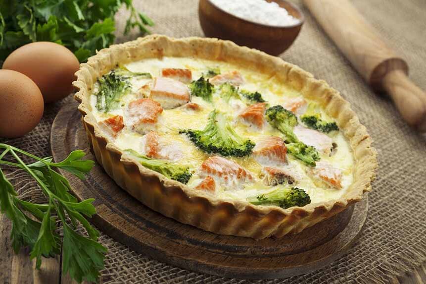 Для приготовления нам потребуется: 1. Первым делом нужно зашпарить брокколи, чтобы они были не сырые, поэтому заливаем кипятком и накрываем тарелочкой и оставляем в сторонку. Ещё очень вкусное блюдо из брокколи, вы можете найти здесь. 2. Начинаем заниматься тестом. Тесто присыпаем мукой, чтоб не прилипало к скалке и начинаем раскатывать. 3. Берем кусочек сливочного масла и полностью смазываем форму для запекания и утрамбовываем в неё наше тесто, лишние края можно подрезать, а если случайно образовалась дырочка, то этими кусочками можно её залатать)) Подготавливаем всё к нашей начинке для пирога: 5. Брокколи уже можно слить, следите, чтоб не осталось воды. 6. Натираем сыр на крупной терке. 7. В ёмкость взбиваем яйца и вливаем сливки, для вкуса добавляем прованские травы, вместе с солью и миксером начинаем взбивать. Собираем наш пирог: 8. Выкладываем брокколи, затем кусочки свежего лосося, следом щедро посыпаем тертым сыром. 9. Всё, финальный штрих - сверху заливаем нашей взбитой смесью