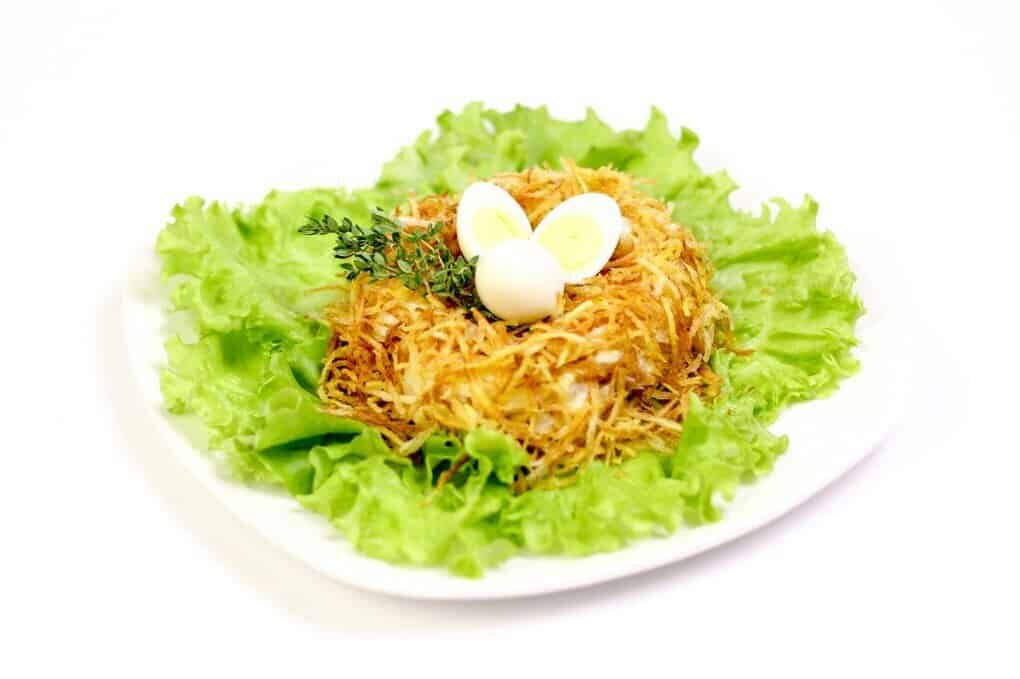 Этот салат имеет такое название, потому что делается в форме гнезда с яйцами посередине. Эффектное блюдо русской кухни.