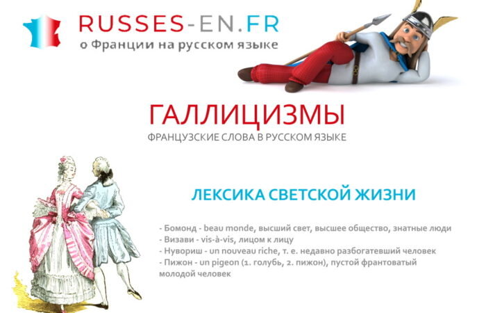 Галлицизмы (от лат. Gallicus – галльский) – слова и выражения, заимствованные из французского языка или образованные по модели французских слов и выражений. Необходимо учитывать, что 99% заимствований из французского имеют латинское (романское) происхождение, а не галльское (кельтское). Термин «галлицызмы» был выбран, чтобы заменить незвучное слово «французизмы». Россия и Франция связаны тесными культурно-историческими узами уже не одно столетие. Взаимодействие русского и французского языков началось еще в Петровскую эпоху, усилилось в конце XVIII – начале XIX века в связи с галломанией светского общества (многие аристократы лучше говорили по-французски, чем по-русски, русские классики – Пушкин, Толстой, Островский, порой использовали в своих художественных произведениях целые абзацы на французском языке) и продолжается до сих пор, например в компьютерной сфере (дискета, домен). В результате, по подсчетам языковедов, в разное время русский язык заимствовал около 2000 французских сло