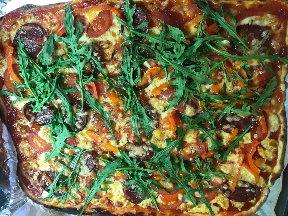 Я долго искала простой рецепт пиццы на тонком тесте и вот методом проб и ошибок, удалось выбрать самый простой и вкусный. Для теста нам понадобится: 100 гр минеральной воды 1/2 ч.ложки сахара 1 ч.ложка сухих дрожжей щепотка соли 200 г муки В чуть подогретую воду кладём сахар, щепотку соли, дрожжи, все хорошо перемешиваем. Муку просеиваем через сито и добавляем нашу жидкую смесь. Хорошо замешиваем тесто и убираем в тёплое место на час. Через час достаём тесто, месим его и раскатываем в плоское для вашего противня. На противень кладём пергаментную бумагу и делаем основу. Смазываем тесто оливковым маслом, затем томатным соусом. Соус можно приготовить самим из томатной пасты с добавлением специй или использовать готовый кетчуп. Я использовала готовый. Для начинки нам понадобится с/к колбаса, болгарский перец, помидоры, сыр. Сыр можно брать любой, лучше всего моцарелла, но подойдёт и сулугуни, российский, какой есть. На томатную основу выкладываем обильно тертый сыр, тонко порезанную колба