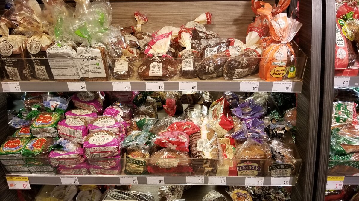 В апреле побывал в обычном супермаркете в Литве. Это третий по величине город страны, живет в нем всего 150 тысяч человек. Зашёл в центре города в обычный супермаркет, название у нео Iki, накупить продуктов в путешествие на пару дней. Давайте вместе посмотрим сколько в Литве — стране Евросоюза стоят обычные продукты. Цены на фото приведены в евро, разумеется. Я буду переводить в рубли по курсу 1 евро = 80 рублей. Хлеб. Хлеб представлен разный. По размеру такие обычные буханки 250-350 граммов. Цена только на некоторые позиции превышают 1 евро, а так весь хлеб стоит чуть меньше. То есть в среднем одна буханка хлеба стоит около 70-80 рублей. В России цена на хлеб ниже примерно на 20%. Сыр. Специально сфотографировал не специальный сыр, типа пармезана или камамбера. Это обычный сыр как наш, типа Российский или Пошехонский. Нарезка в 150 граммов стоит 1,30 евро — это около 100 рублей. Куски сыра по 250 граммов стоят 2 евро — 160 рублей. А, например, головка камамбера в 125 граммов стоит