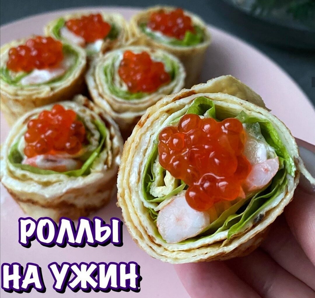 Самые вкусные роллы на ужин Белковые и низкокалорийные!!! Нам понадобится : 2 яйца 50 мл молока Специи по вкусу Начинка: Лист салата Огурец Креветки (крабовое мясо, куриное филе) Творожный сыр или сметана Для начала соединяем два яйца, молоко и специи . Жарим из него блинчики. На блинчик выкладываем начинку и заворачиваем. Нарезаем порционно. Можно украсить икрой. Наслаждаемся вкусными роллами! 😘