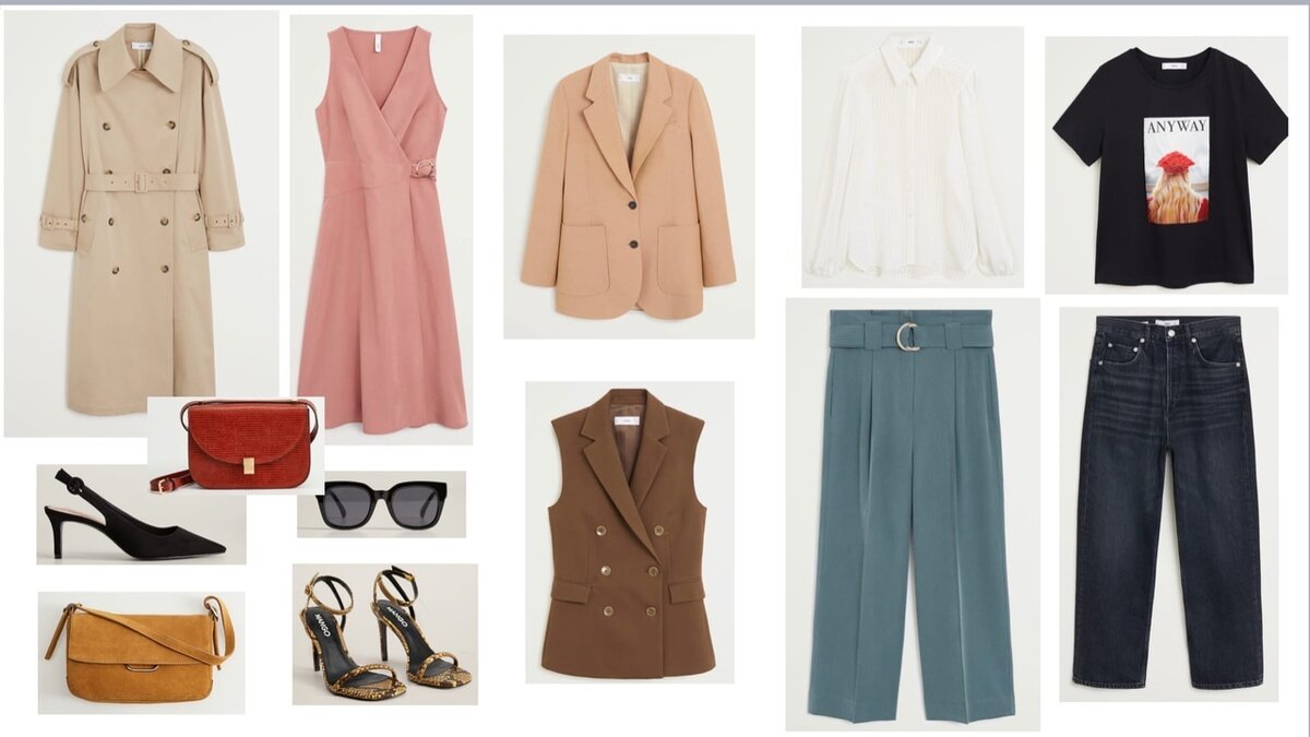Привет, дорогой читатель! Для тебя я создала небольшую, но универсальную капсулу для прохладного лета. Она подойдет и для работы, и для прогулок и вечерних походов в кафе, кино и рестораны. Одежду брала исключительно с распродажи, поэтому выбор был невелик. Цены тебя ждут в конце👇 А дальше я для тебя подготовила 6 готовых образов, чтобы было понятно, что капсула работает. Можно составить куда больше... А сколько образов получилось у тебя? И как обещала - цены (на 31 мая в интернет магазине Mango, распродажа) 1. Двубортный тренч - 11999р 2. Структурированный пиджак изо льна - 5999р 3. Жилет с двубортной застежкой - 4999р 3. Брюки - 2999р 4. Платье - 3299 5. Рубашка с пышными рукавами - 1999р 6. Джинсы - 2999р 7. Футболка с принтом - 1699р 8. Сумка багет из замши - 1999р 9. Сумка фактурная - 1799р 10. Сандалии с выделкой под змею - 1999р 11. Туфли на каблуке - 1999р 12. Очки - 1299р Не забудь поставить лайк и подписаться на канал;) Тебе может быть интересно: 1. Как стильно носить шел
