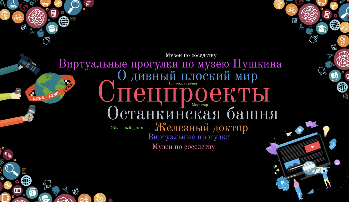 Мы уже начали говорить о спецпроектах, которые достойны вашего внимания: Топ-5 медиапроектов: от Верещагина до Дудя. Сегодня продолжаем разбираться в этой теме. МУЗЕИ ПО СОСЕДСТВУ Сайт малых музеев Третьяковской галереи. Раздел о каждом авторе состоит из трех частей: «Узнавай историю», «Знакомься с соседями», «Играй», они дополнены историями современных соседей, играми, тестами, разбором деталей картин под «художественным микроскопом», стикерами для Telegram. Специально для проекта были оцифрованы рисунки, расшифрованы дневники, записные книжки и письма. Проект популяризирует музеи, знакомит с их историей, интересными фактами из жизни художников. Виртуальные прогулки по музею ГМИИ им. Пушкина Проект портала культурного наследия России, позволяющий совершить виртуальные прогулки по главным экспозиционным залам музея ГМИИ Пушкина и прошедшим выставкам. Цели проекта - просвещение и привлечение внимания к русской культуре. МЕРКАТОР: О ДИВНЫЙ ПЛОСКИЙ МИР Останкинская башня: полвека величия