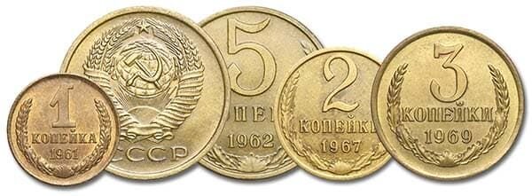 Что касается остальных монет из никелевых сплавов и алюминиевой бронзы (из нее выпускались в советское время копейки, «двушки», трехкопеечники и пятаки), то среди них особо дорогих нет. Только номиналы от 1 копейки до 1 рубля 1958 года, выпущенные опытной партией. Цена полного набора из 9 монет сегодня – 50 000 рублей. Еще есть довольно редкие, но не слишком дорогие монеты 1961 года – 1 рубль и 50 копеек, которые сегодня стоят 300-500 рублей.