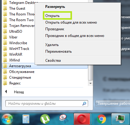 Самый простой метод – перенесение программной иконки в блок автоматической загрузки («Пуск», графа «Все программы»). С помощью правой кнопки мыши откройте меню, найдите там строку «Открыть»: