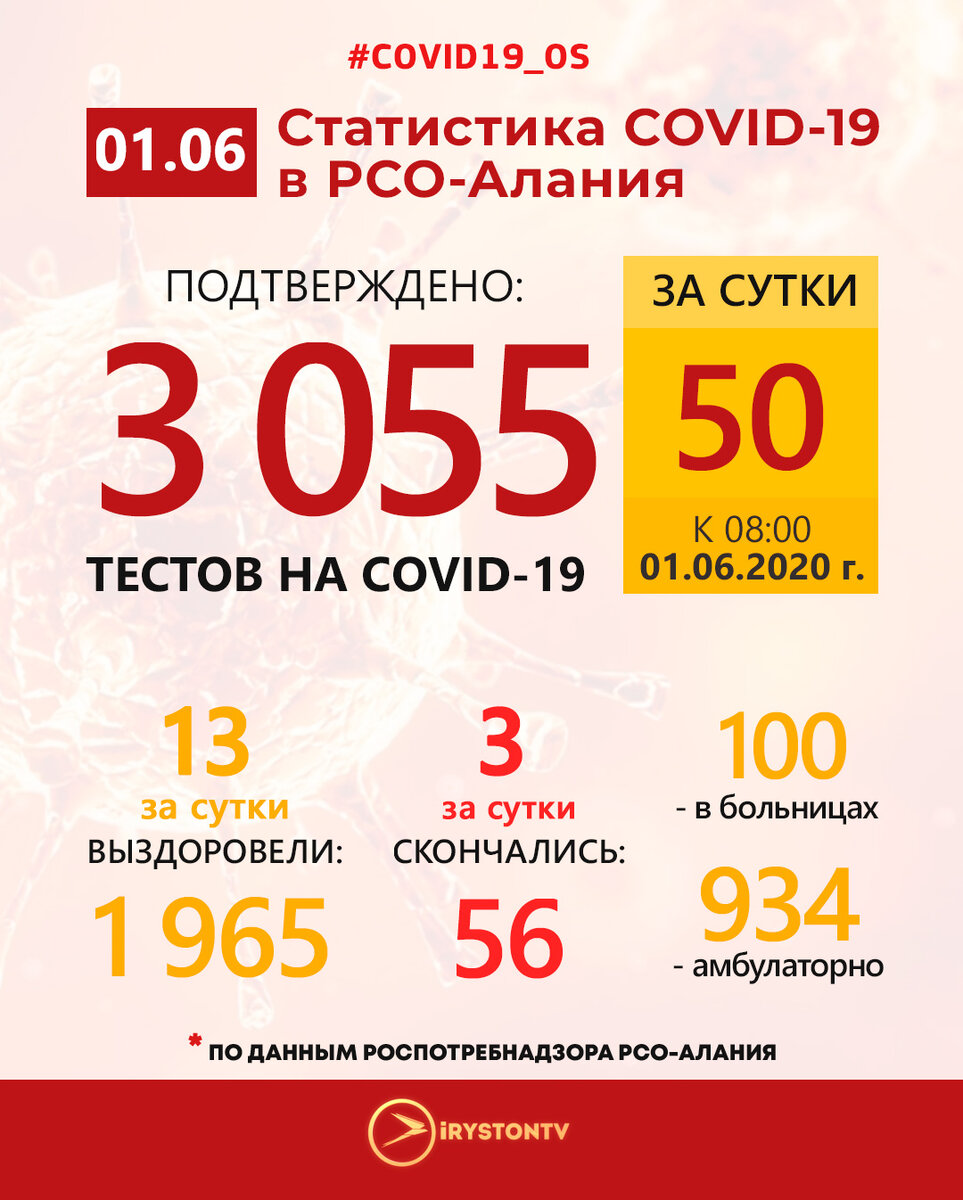 3 055 (50 за сутки) положительных тестов на COVID-19 подтверждено к 1 июня 08:00 (Мск) по данным Роспотребнадзора РСО-Алания.