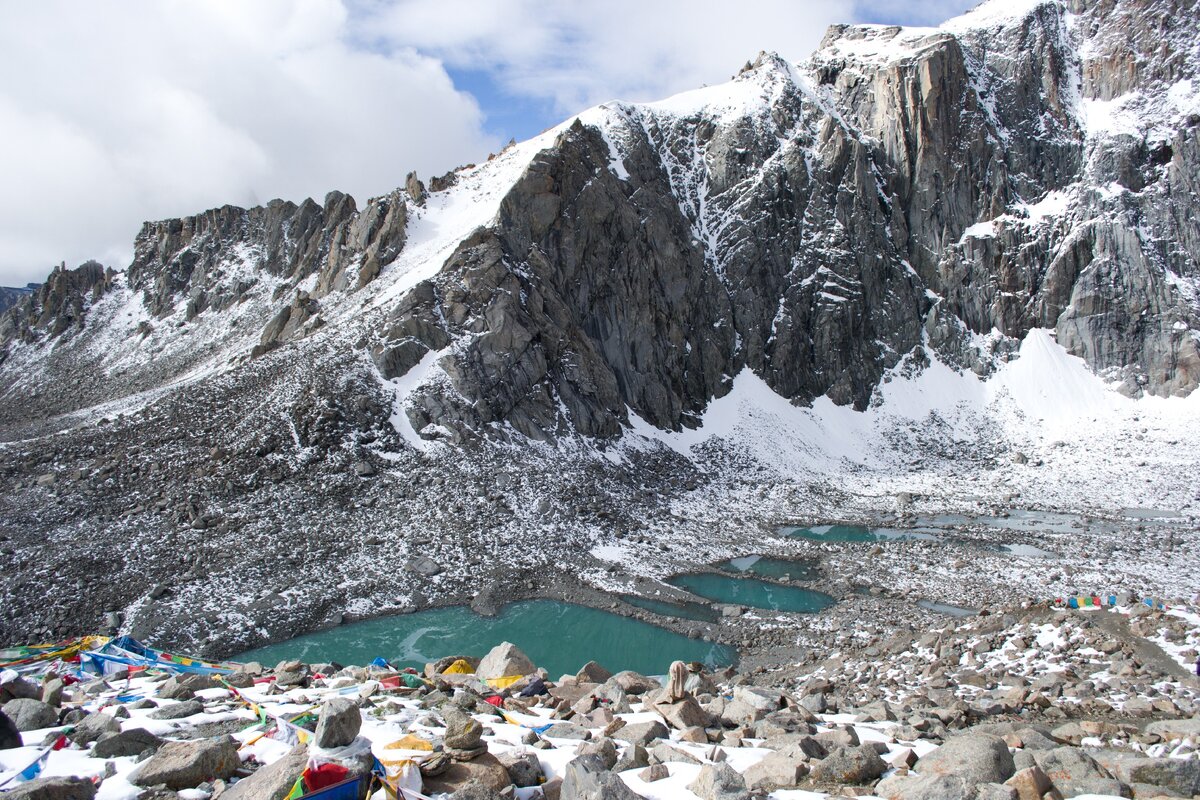 Сразу за перевалом Дролма Ла находятся пять вершин, которые считаются обиталищем богинь Тшеринг Чхе Нга («Пять сестер»), а рядом цепочка маленьких бирюзовых озер Тудже Ченпо, Гаури Кунд, Тук Тсо (5608м). Богини являются защитницами гор Джомолунгма, Гауришанкар и Кайлас. Дальше дорога идет мимо странного скального образования, которое Мулдашев назвал Топор Кармы. Поскольку апофеоз Коры уже позади, а Кору совершают ради очищения от грехов, то название можно считать близким к истине: здесь как бы «отрубается» карма за прошлые грехи. В книге Балалаева о Тибете сказано, что под шестом с флагами на перевале находится большой синий камень Долма До: когда монах Готсангпа, основавший монастырь Дира Пхук, искал дорогу к главному перевалу Коры, он повстречал стаю из 21 голубого волка, которые на самом деле являлись эманацией Долма, духа перевала. Около камня волки слились в одного и тот ушел в камень. Восточное «ледяное» лицо Кайласа опять спряталось в облаках. В разрывах между скалами виден